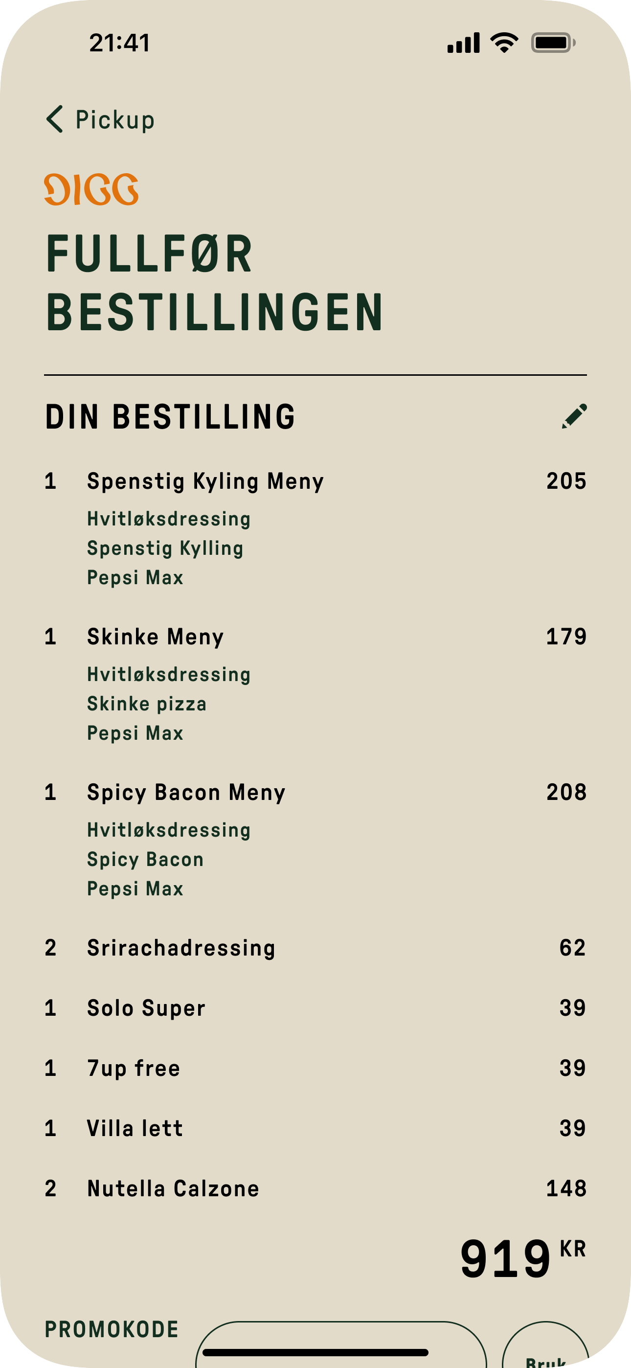 A challenge about designing an order review screen for a pizza shop in Norway, for which I picked Digg because it has a mature visual identity, and simply I liked the brand.